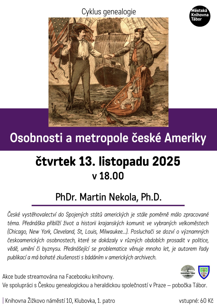 Přednáška z cyklu Genealogie. České vystěhovalectví do Spojených států amerických je stále poměrně málo zpracované téma. Přednáška přiblíží život a historii krajanských komunit ve vybraných velkoměstech (Chicago, New York, Cleveland, St, Louis, Milwaukee...). Vstupné: 60 Kč | VSTUPENKY