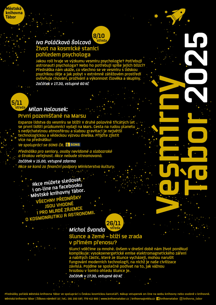 Přednáška z cyklu Vesmírný Tábor. Slunci vděčíme za mnohé. Ovšem v dnešní době nám život poněkud komplikuje: vysokoenergetické emise elektromagnetického záření a nabitých částic, které ze Slunce vycházejí, mohou narušit fungování moderních technologií, na nichž je naše civilizace závislá. Pojďme se společně podívat na to, jak vážnou hrozbou v tomto ohledu Slunce je. Vstupné: 60 Kč | VSTUPENKY