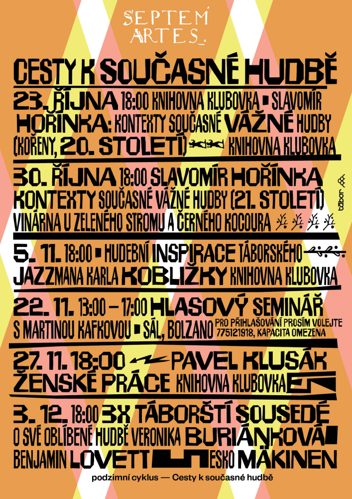 Cyklus Cesty k současné hudbě. Pořádá Sousedská univerzita Septem Artes ve spolupráci s Městskou knihovnou Tábor. Akce se koná s podporou města Tábor.