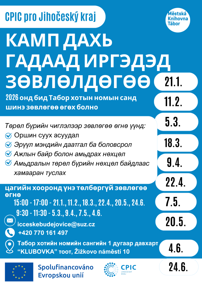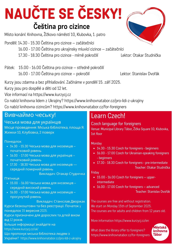 - 15:00 - 16:00: Čeština pro cizince – středně pokročilí