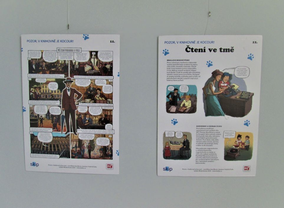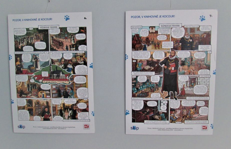 Výstava 15 závěsných panelů s komiksy a ilustracemi Vojty Šedy z knihy Pozor v knihovně je kocour!