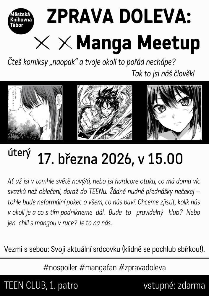 Ať už jsi v tomhle světě nový/á, nebo jsi hardcore otaku, co má doma víc svazků než oblečení, doraž do TEENu. Žádné nudné přednášky nečekej – tohle bude neformální pokec o všem, co nás baví. Chceme zjistit, kolik nás v okolí je a co s tím podnikneme dál. Bude to pravidelný klub? Nebo jen chill s mangou v ruce? Je to na nás.